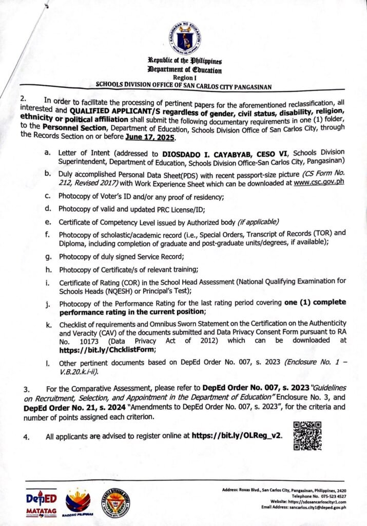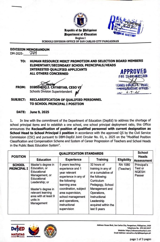 Division Memorandum No. 244 s, 2025 – RECLASSIFICATION OF QUALIFIED PERSONNEL TO SCHOOL PRINCIPAL I POSITION