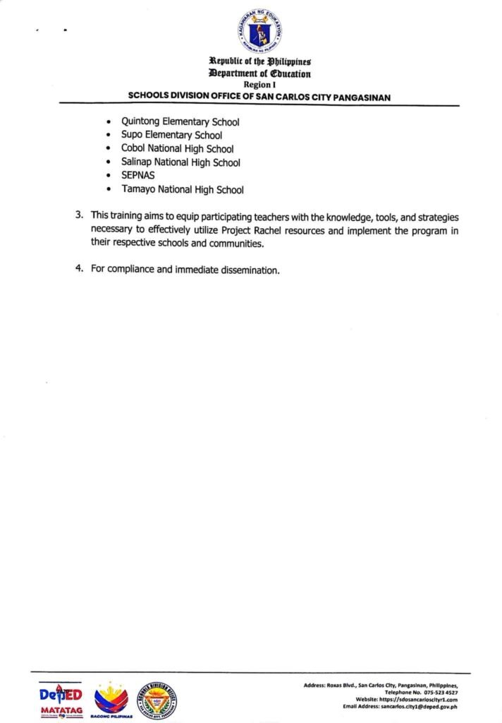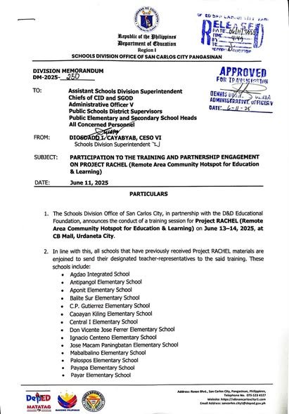 Division Memorandum No. 250 s, 2025 – PARTICIPATION TO THE TRAINING AND PARTNERSHIP ENGAGEMENT ON PROJECT RACHEL (Remote Area Community and Hotspot for Education & Learning)