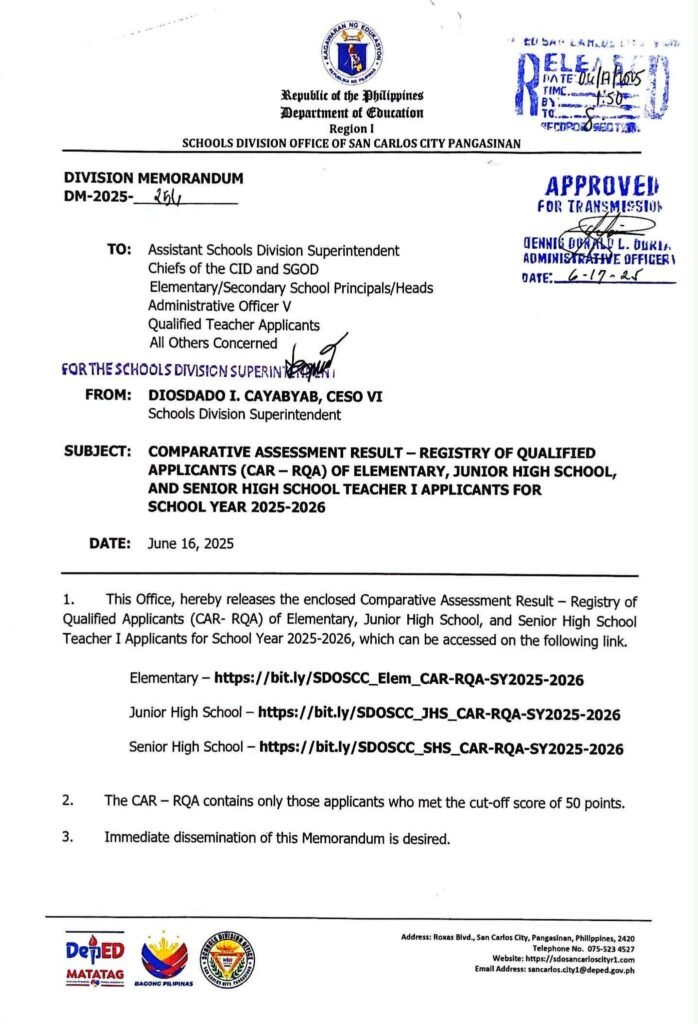 Division Memorandum No. 256 s, 2025 – COMPARATIVE ASSESSMENT RESULT – REGISTRY OF QUALIFIED APPLICANTS (CAR – RQA) OF ELEMENTARY, JUNIOR HIGH SCHOOL, AND SENIOR HIGH SCHOOL TEACHER I APPLICANTS FOR SCHOOL YEAR 2025-2026 Elementary – https://bit.ly/SDOSCC_Elem_CAR-RQA-SY2025-2026 Junior High School – https://bit.ly/SDOSCC_JHS_CAR-RQA-SY2025-2026 Senior High School – https://bit.ly/SDOSCC_SHS_CAR-RQA-SY2025-2026