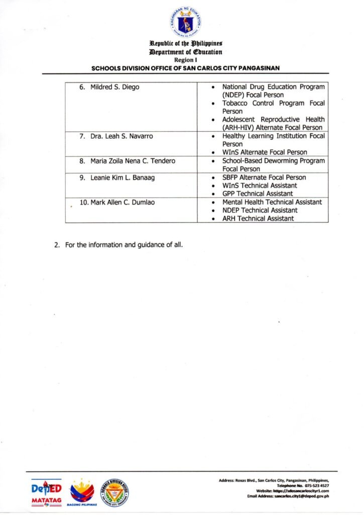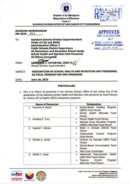 Division Memorandum No. 262 s, 2025 – DESIGNATION OF SCHOOL HEALTH AND NUTRITION UNIT PERSONNEL AS FOCAL PERSONS FOR OKD PROGRAMS