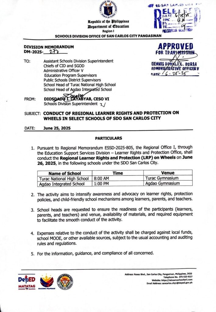 Division Memorandum No. 272 s, 2025 – CONDUCT OF REGIONAL LEARNER RIGHTS AND PROTECTION ON WHEELS IN SELECT SCHOOLS OF SDO SAN CARLOS CITY