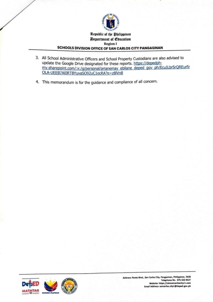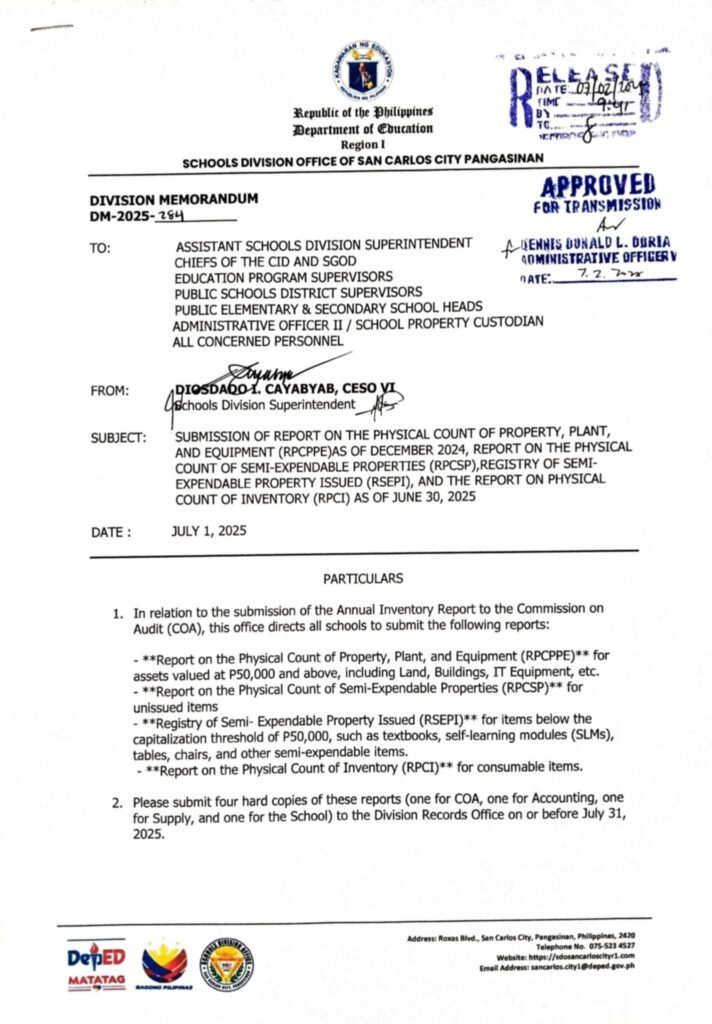 Division Memorandum No. 284 s, 2025 – Submission of Report on the Physical Count of Property, Plant, and Equipment (RPCPPE)as of December 2024, Report on the Physical Count of Semi-Expendable Properties (RPCSP), Registry of Semi-Expendable Property Issued (RSEPI), and the Report on Physical Count of Inventory (RPCI) as of June 30, 2025