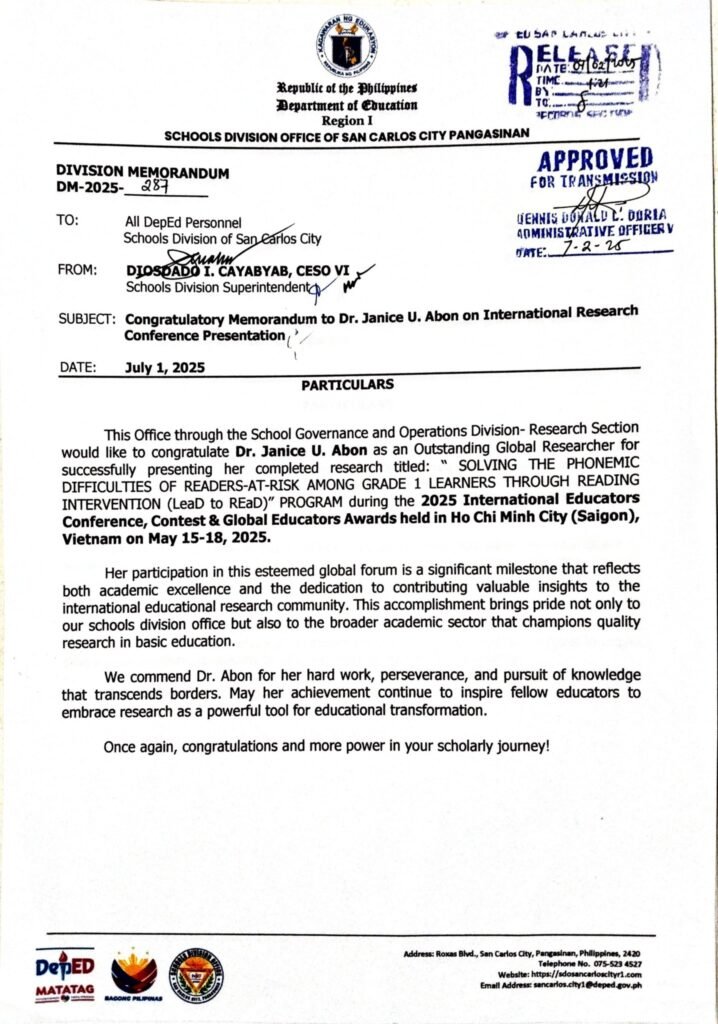 Division Memorandum No. 287 s, 2025 – Congratulatory Memorandum to Dr. Janice U. Abon on International Research Conference Presentation