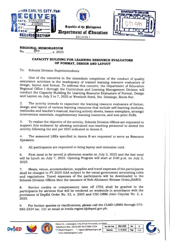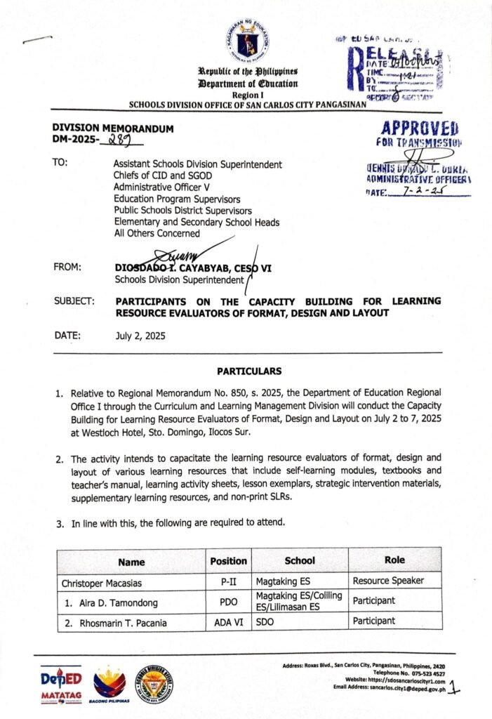 Division Memorandum No. 289 s, 2025 – PARTICIPANTS ON THE CAPACITY BUILDING FOR LEARNING RESOURCE EVALUATORS OF FORMAT, DESIGN AND LAYOUT