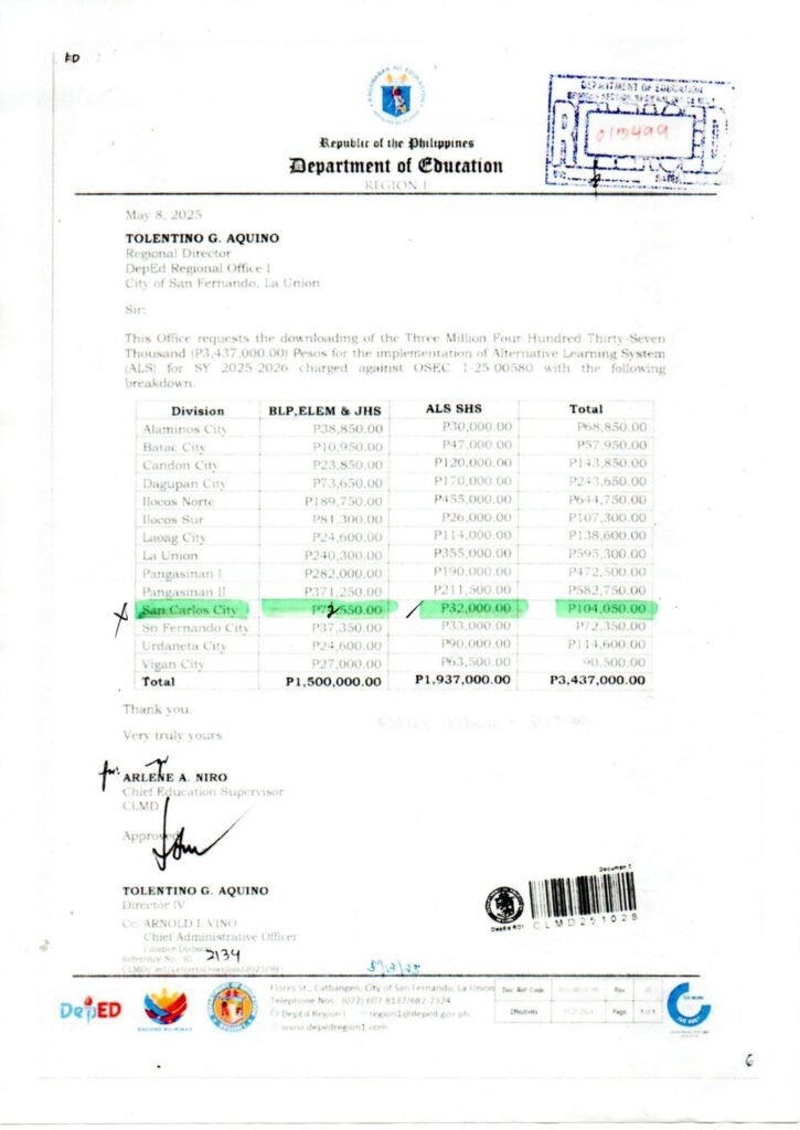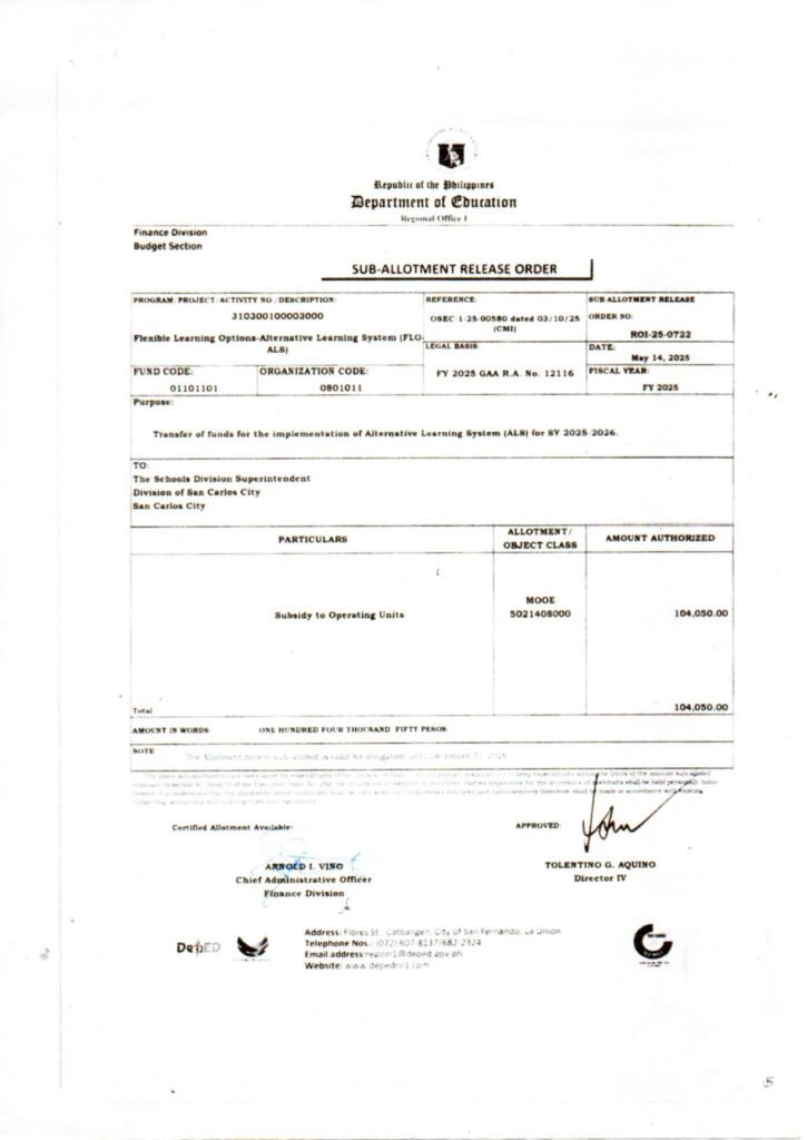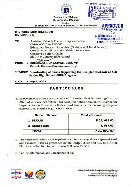 Division Memorandum No. 295 s, 2025 – Downloading of Funds Supporting the Recipient Schools of ALS Senior High School (SHS) Program