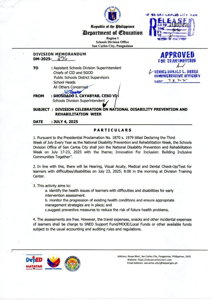 Division Memorandum No. 296 s, 2025 – DIVISION CELEBRATION ON NATIONAL DISABILITY PREVENTION AND REHABILITATION WEEK