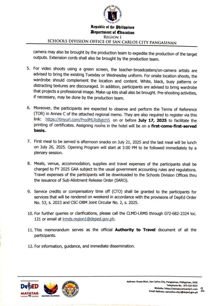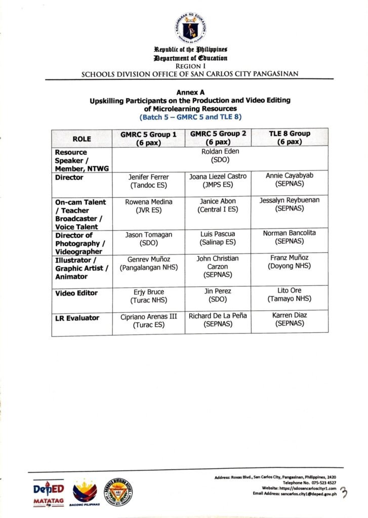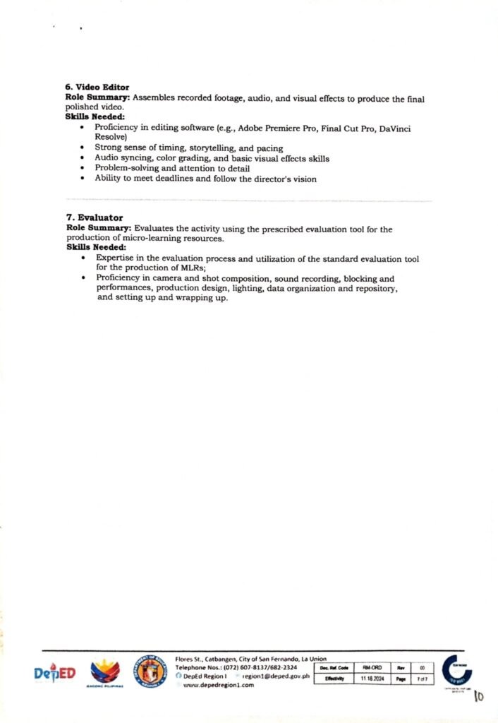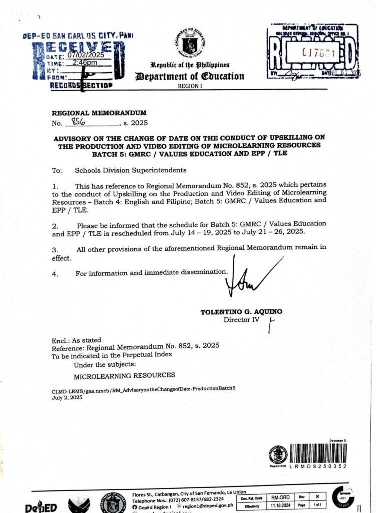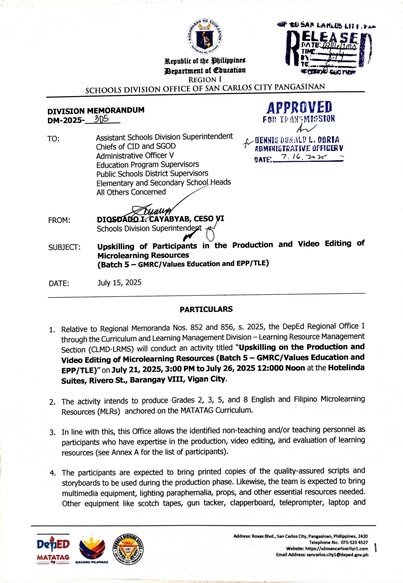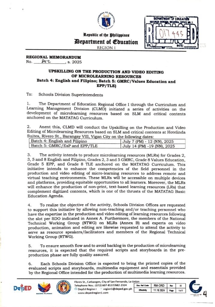 Division Memorandum No. 305 s, 2025 – Upskilling of Participants in the Production and Video Editing of Microlearning Resources (Batch 5-GMRC/Values Education and EPP/TLE)
