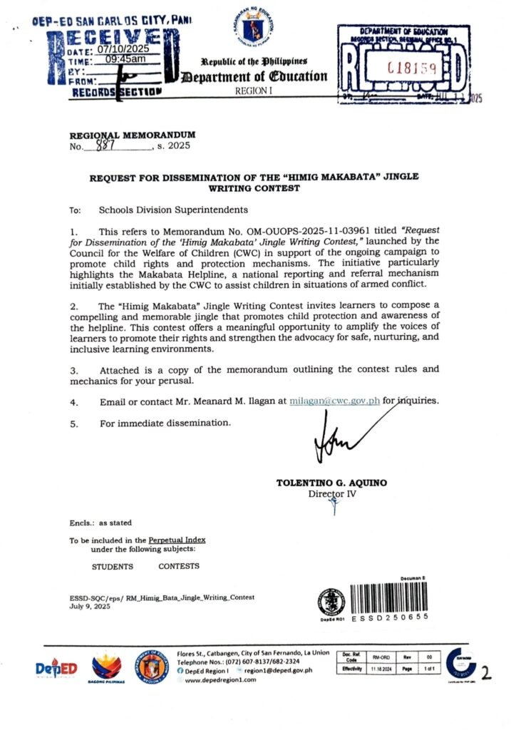 Division Memorandum No. 307 s, 2025 – REQUEST FOR DISSEMINATION OF THE “HIMIG MAKABATA” JINGLE WRITING CONTEST