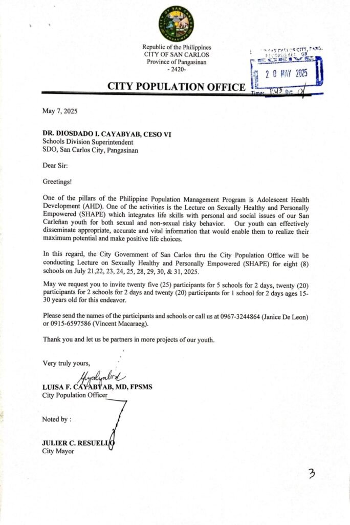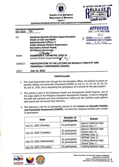 Division Memorandum No. 308 s, 2025 – PARTICIPATION TO THE LECTURE ON SEXUALLY HEALTHY AND PERSONALLY EMPOWERED (SHAPE)