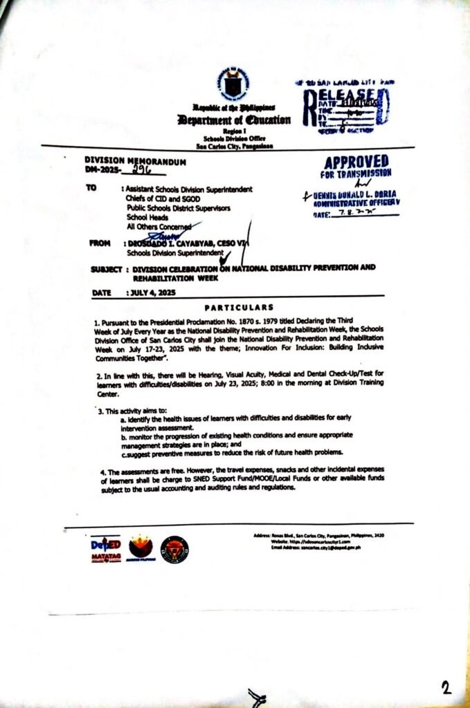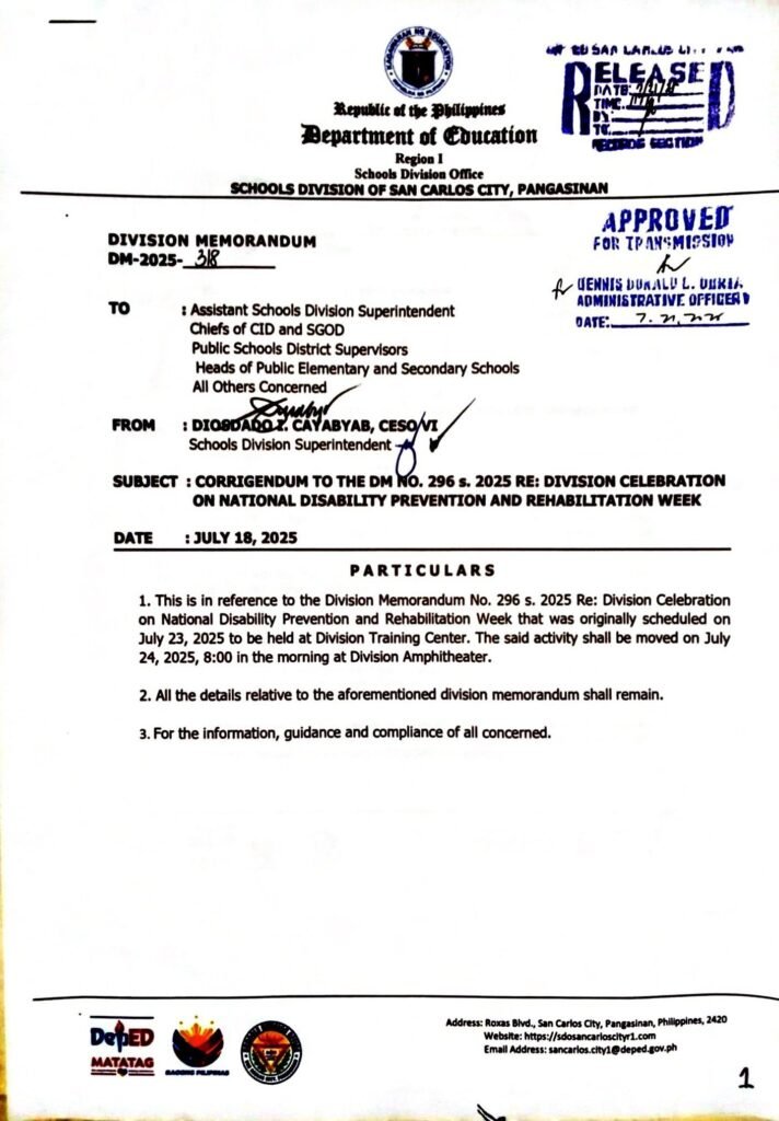 Division Memorandum No. 318 s, 2025 – CORRIGENDUM TO THE DM NO. 296 S. 2025 RE: DIVISION CELBRATION OM NATIONAL DISABILITY PREVENTION AND REHABILITATION WEEK