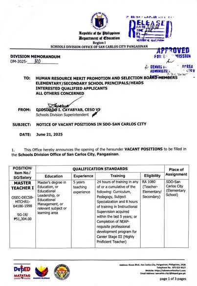 Division Memorandum No. 320 s, 2025 – Notice of Vacant Positions in SDO – San Carlos City