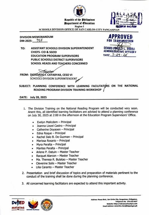 Division Memorandum No. 325 s, 2025 – PLANNING CONFERENCE WITH LEARNING FACILITATORS ON THE NATIONAL READING PROGRAM DIVISION TRAINING-WORKSHOP