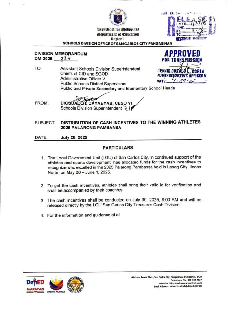 Division Memorandum No. 326 s, 2025 – DISTRIBUTION OF CASH INCENTIVES TO THE WINNING ATHLETES 2025 PALARONG PAMBANSA