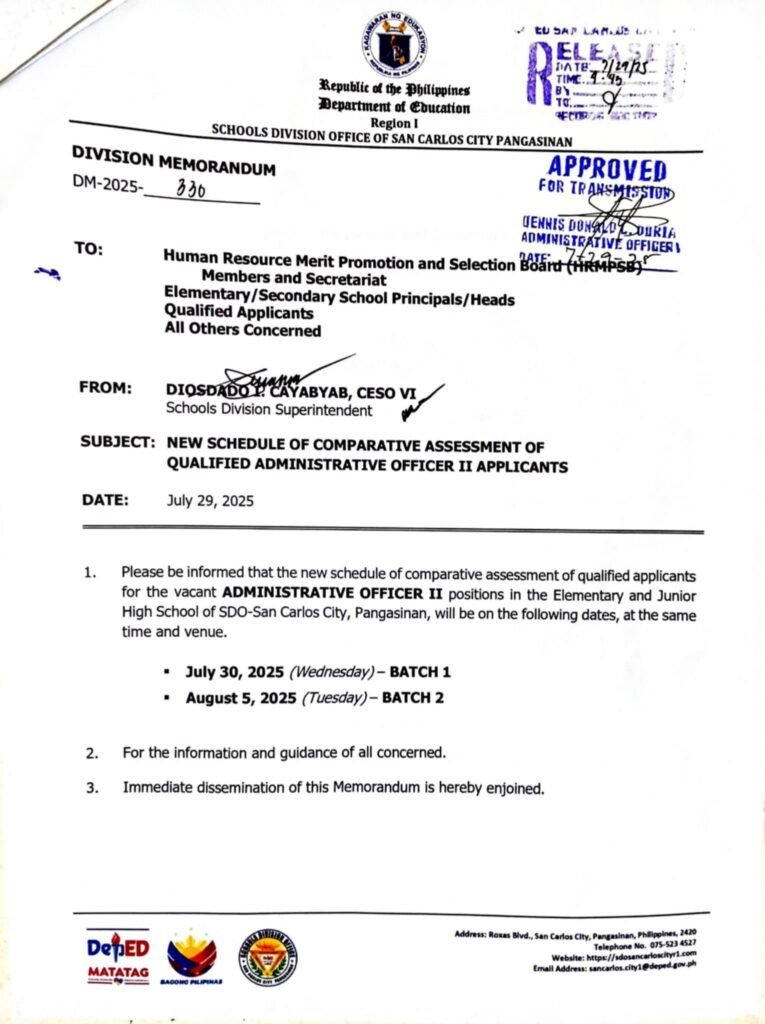 Division Memorandum No. 330 s, 2025 – NEW SCHEDULE OF COMPARATIVE ASSESSMENT OF QUALIFIED ADMINISTRATIVE OFFICER II APPLICANTS