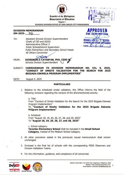 Division Memorandum No. 340 s, 2025 – CORRIGENDUM TO DIVISION MEMORANDUM NO. 331, S. 2025, “CONDUCT OF ONSITE VALIDATION FOR THE SEARCH FOR 2025 BRAGADA ESKWELA PROGRAM IMPLEMENTERS”