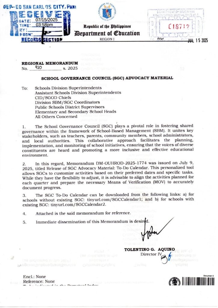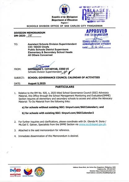 Division Memorandum No. 345 s, 2025 – SCHOOL GOVERNANCE COUNCIL CALENDAR OF ACTIVITIES