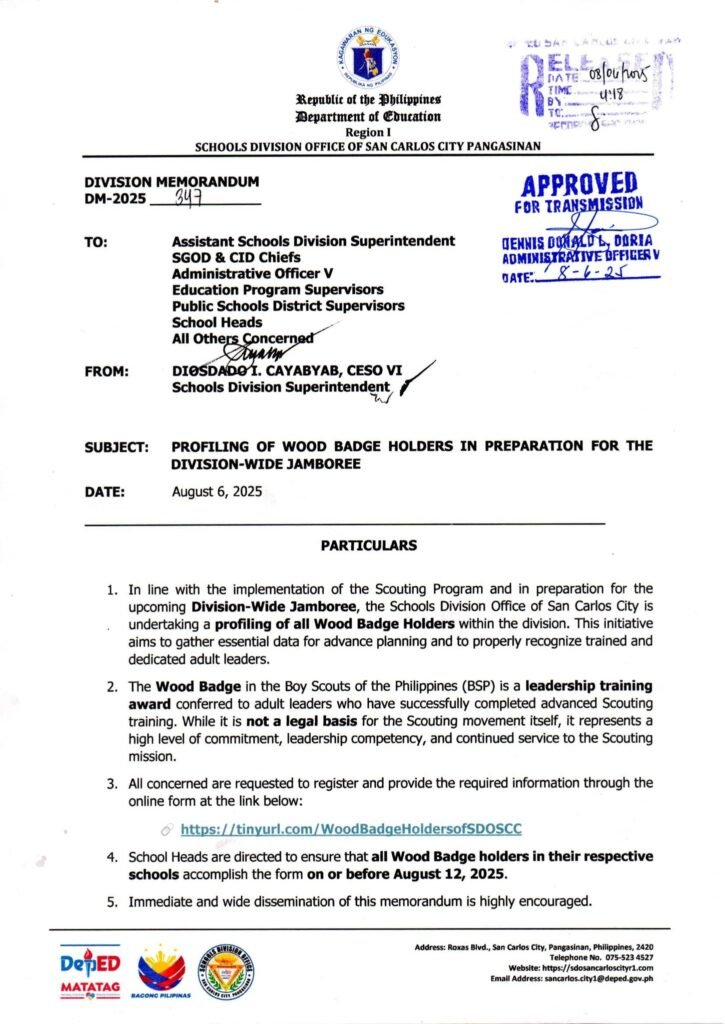 Division Memorandum No. 347 s, 2025 – PROFILING OF WOOD BADGE HOLDERS IN PREPARATION FOR THE DIVISION-WIDE JAMBOREE