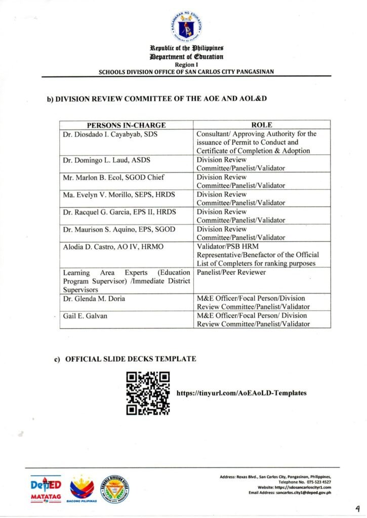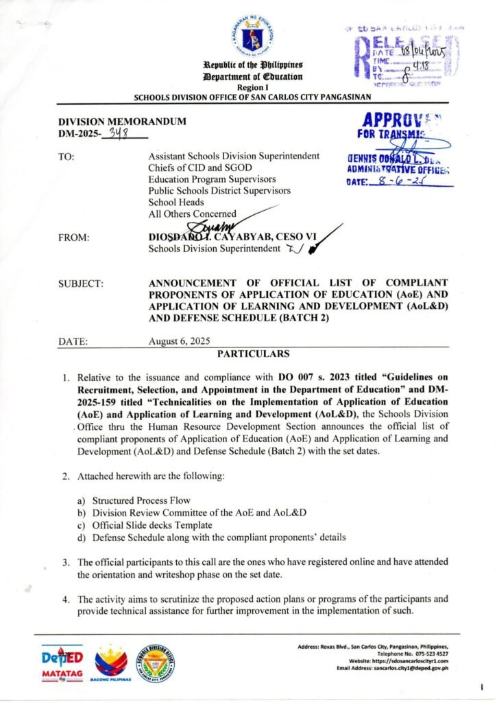 Division Memorandum No. 348 s, 2025 – ANNOUNCEMENT OF OFFICIAL LIST OOF COMPLIANT PROPONENTS OF APPLICATION OF EDUCATION (AoE) AND APPLICATION OF LEARNING AND DEELOPMENT (AoL&D) AND DEFENSE SCHEDULE (BATCH 2)