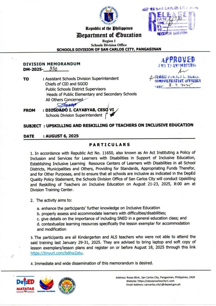 Division Memorandum No. 350 s, 2025 – UPSKILLING AND RESKILLING OF TEACHERS ON INCLUSIVE EDUCATION