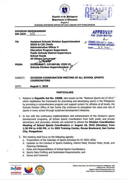 Division Memorandum No. 352 s, 2025 – DIVISION COORDINATION MEETING OF ALL SCHOOL SPORTS COORDINATORS