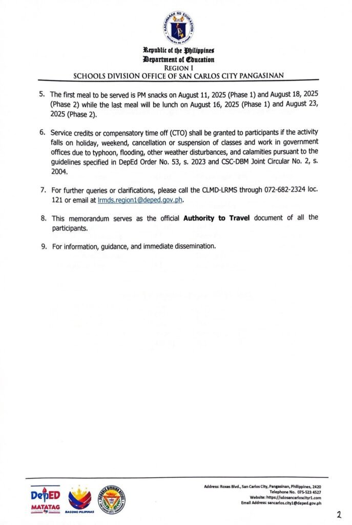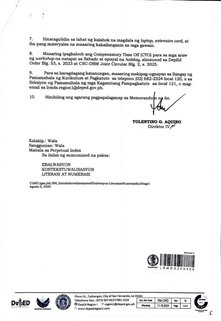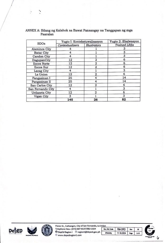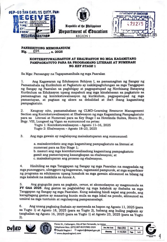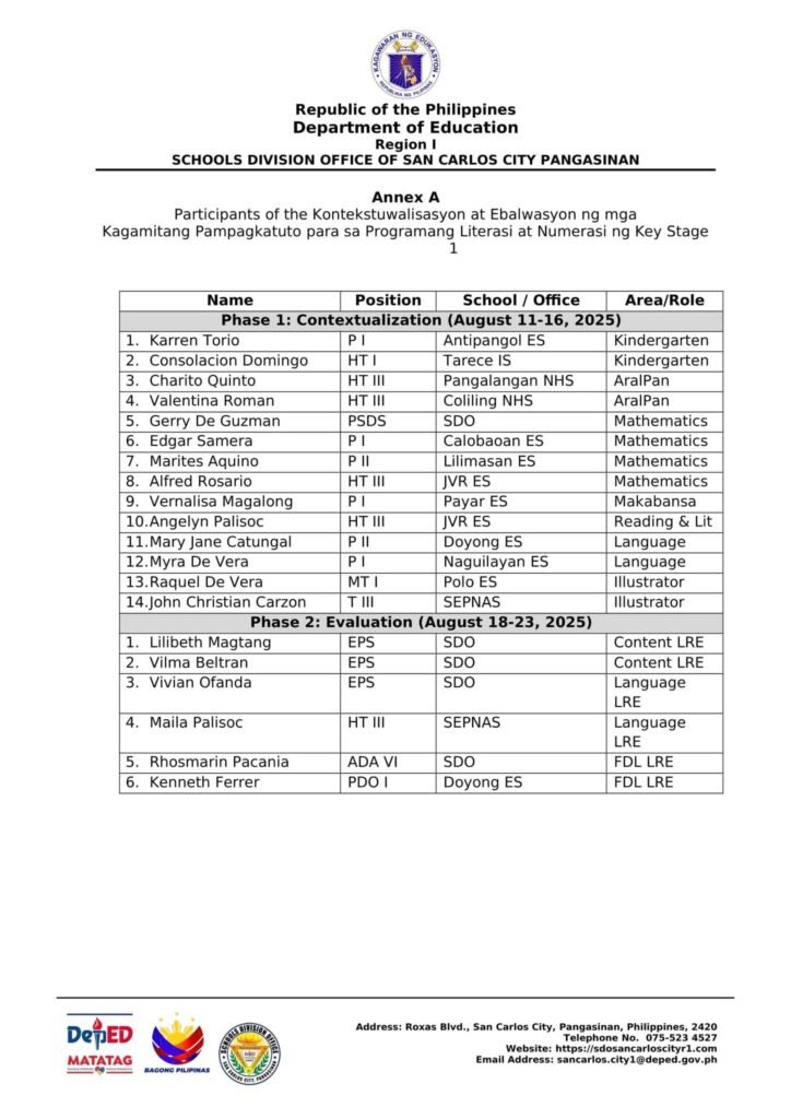 Division Memorandum No. 353 s, 2025 – Participants of the Kontekstuwalisasyon at Ebalwasyon ng mga Kagamitang Pampagkatuto para sa Programang Literasi at Numerasi ng Key Stage 1