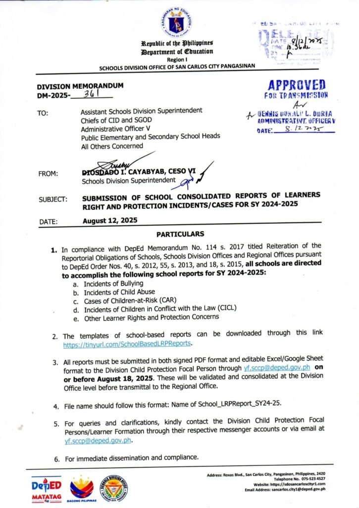 Division Memorandum No. 361 s, 2025 – SUBMISSION OF SCHOOL CONSOLIDATED REPORTS OF LEARNERS RIGHT AND PROTECTION INCIDENTS/CASES FOR SY 2024-2025
