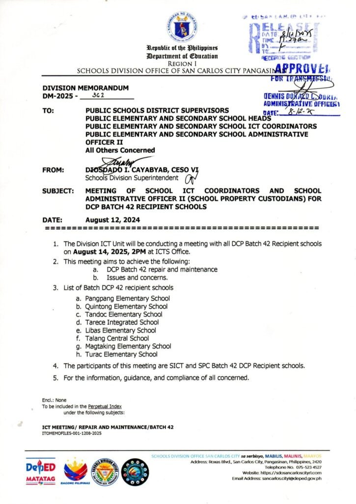 Division Memorandum No. 362 s, 2025 – MEETING OF SCHOOL INFORMATION AND COMMUNICATIONS TECHNOLOGY (ICT COORDINATORS AND SCHOOL ADMINISTRATIVE OFFICER II (SCHOOL PROPERTY CUSTODIANS) FOR DCP BATCH 42 RECIPIENT SCHOOLS