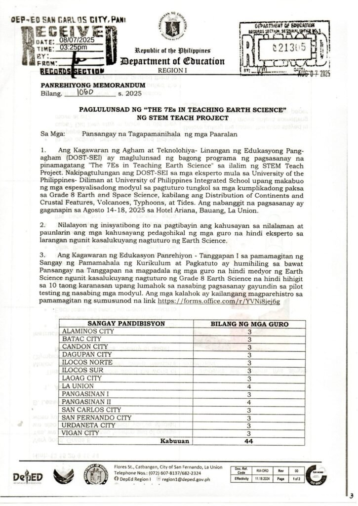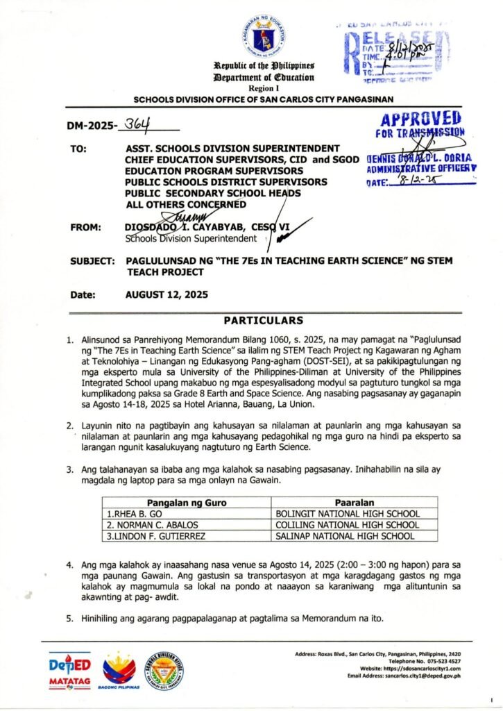Division Memorandum No. 364 s, 2025 – PAGLULUNSAD NG “THE 7Es IN TEACHING EARTH SCIENCE” NG STEM TEACH PROJECT
