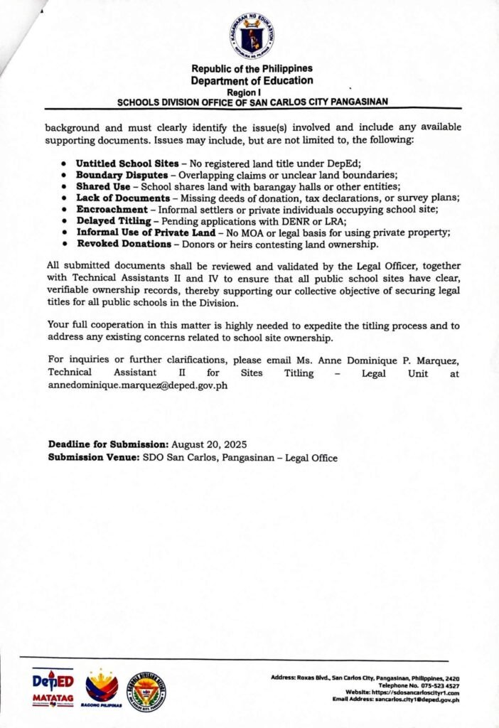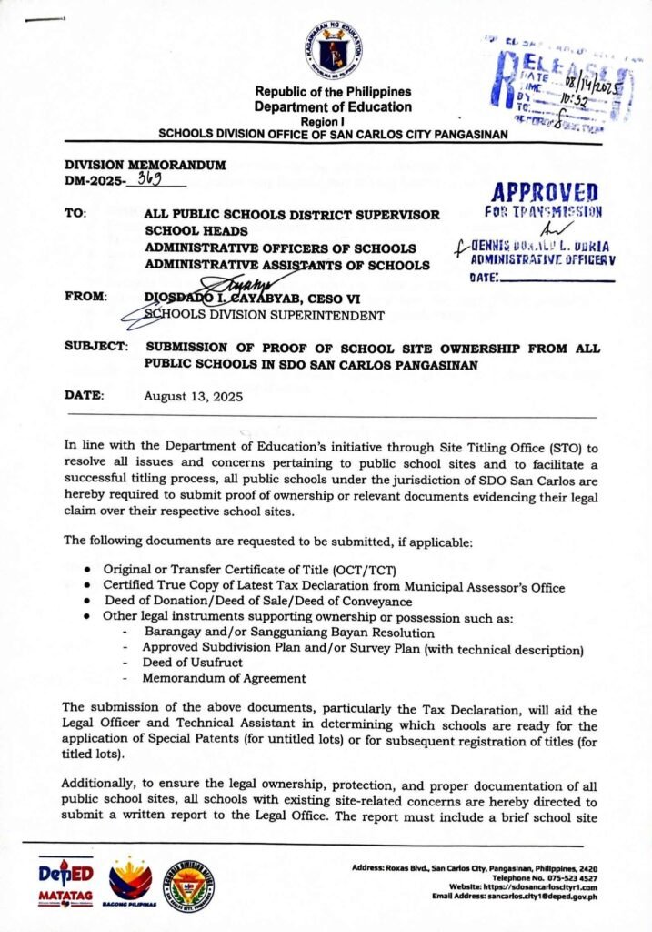 Division Memorandum No. 369 s, 2025 – SUBMISSION OF PROOF OF SCHOOL SITE OWNERSHIP FROM ALL PUBLIC SCHOOLS IN SDO SAN CARLOS PANGASINAN