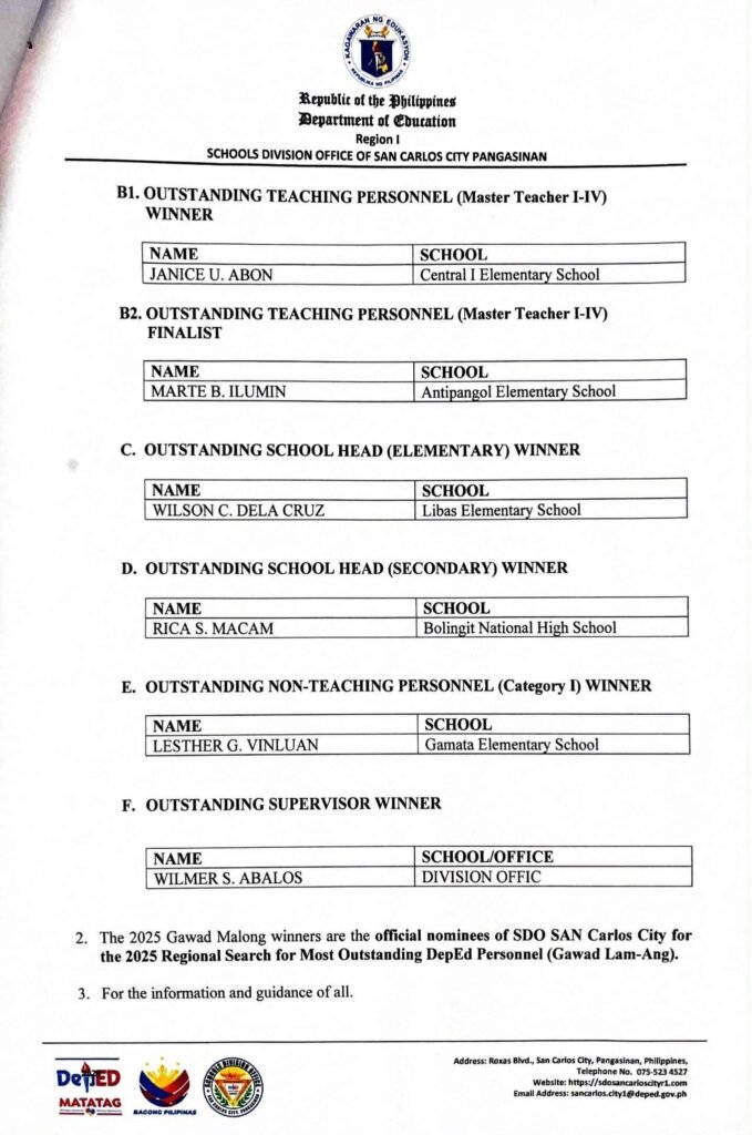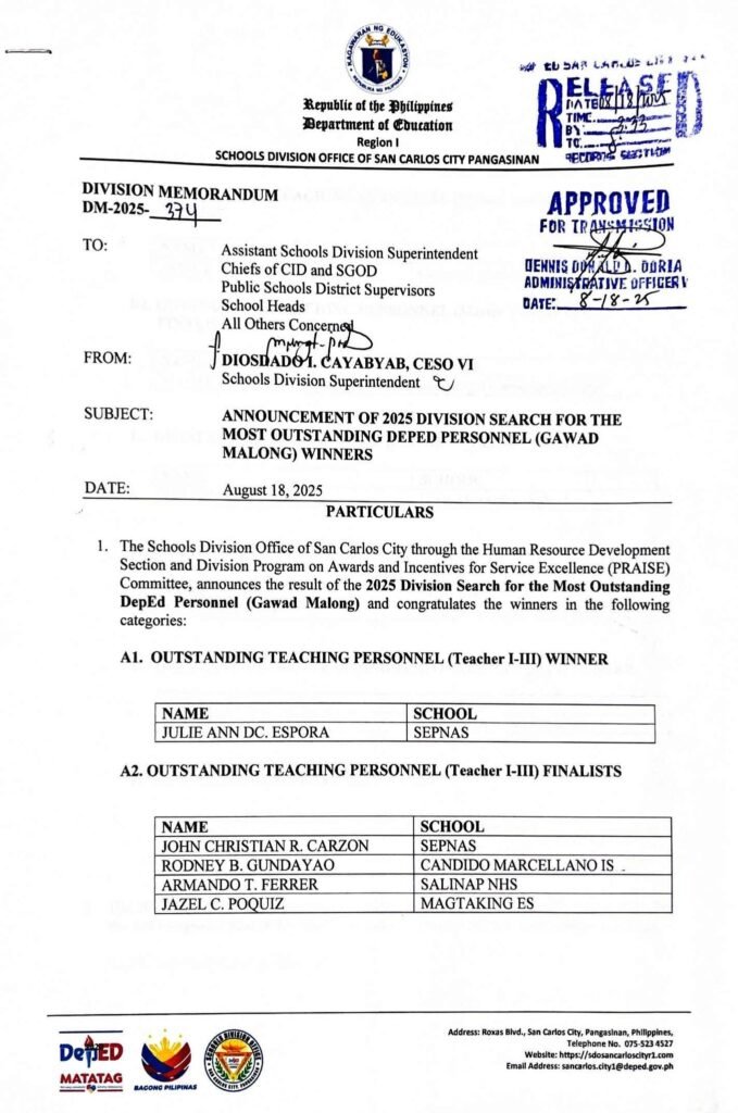 Division Memorandum No. 374 s, 2025 – ANNOUNCEMENT OF 2025 DIVISION SEARCH FOR THE MOST OUTSTANDING DEPED PERSONNEL (GAWAD MALONG) WINNERS
