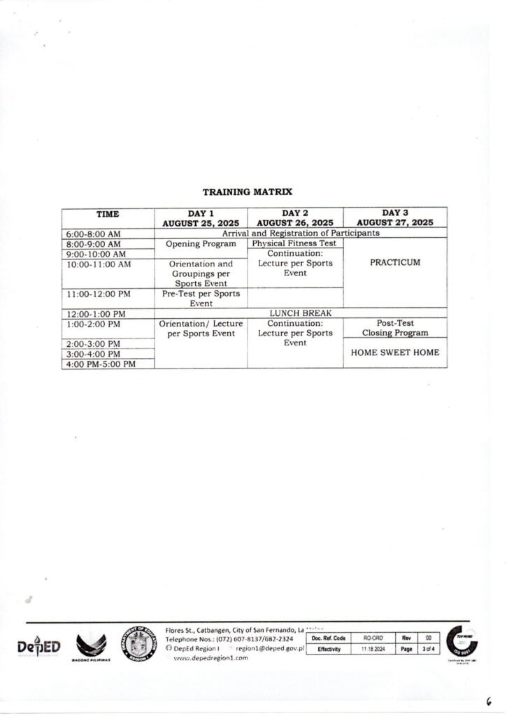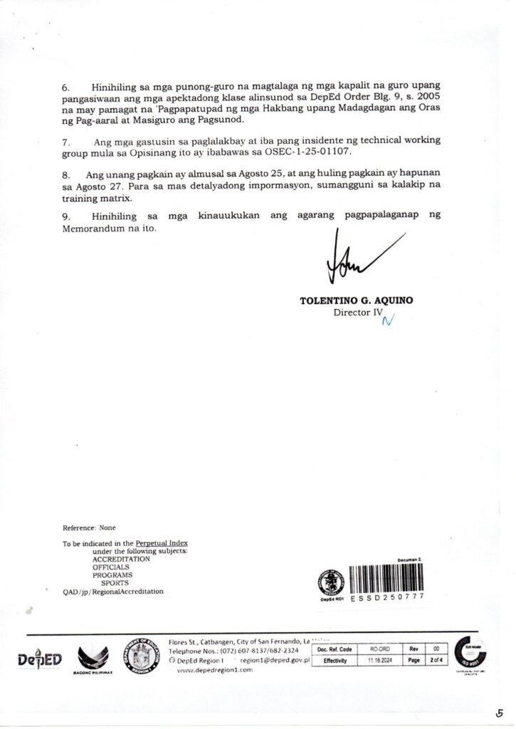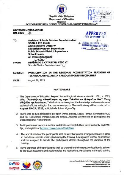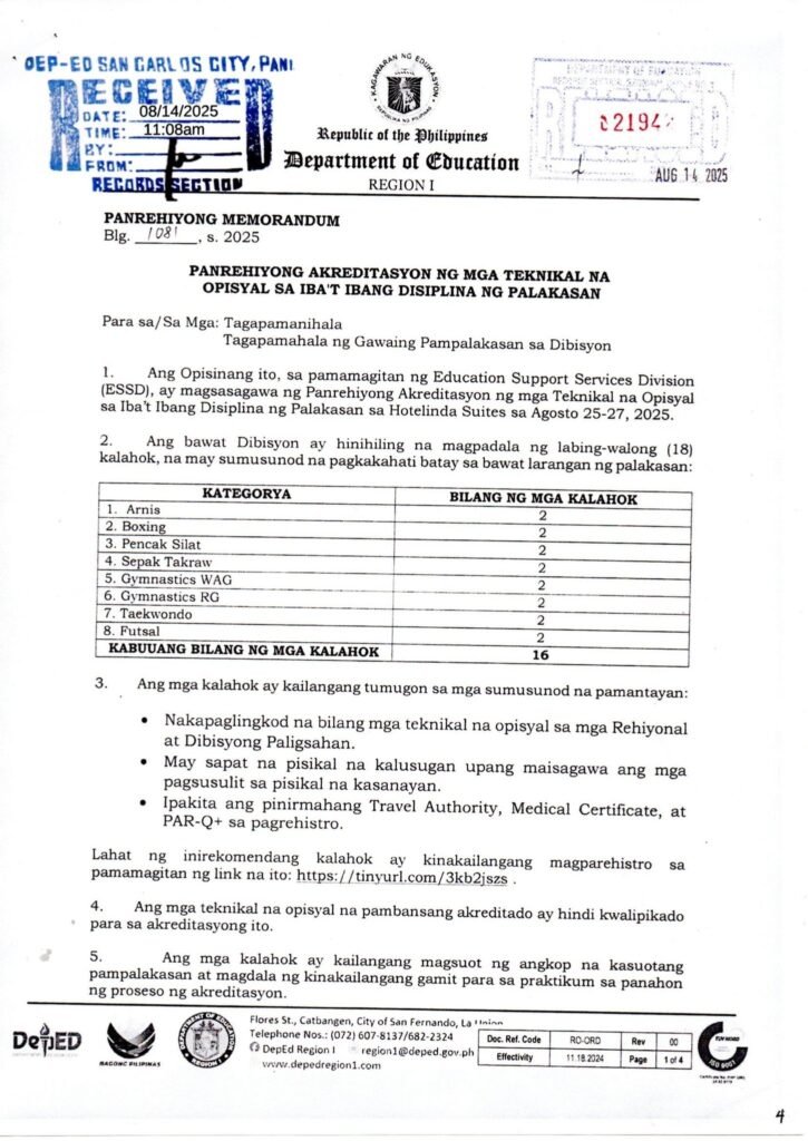 Division Memorandum No. 378 s, 2025 – PARTICIPATION IN THE REGIONAL ACCREDITATION TRAINING OF TECHNICAL OFFICIALS IN VARIOUS SPORTS DISCIPLINES