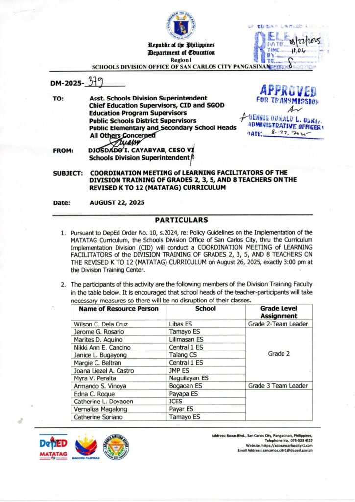 Division Memorandum No. 379 s, 2025 – COORDINATION MEETING OF LEARNING FACILITATORS OF THE DIVISION TRAINING OF GRADE 2,3,5 AND 8 TEACHERS ON THE REVISED K TO 12 (MATATAG) CURRICULUM