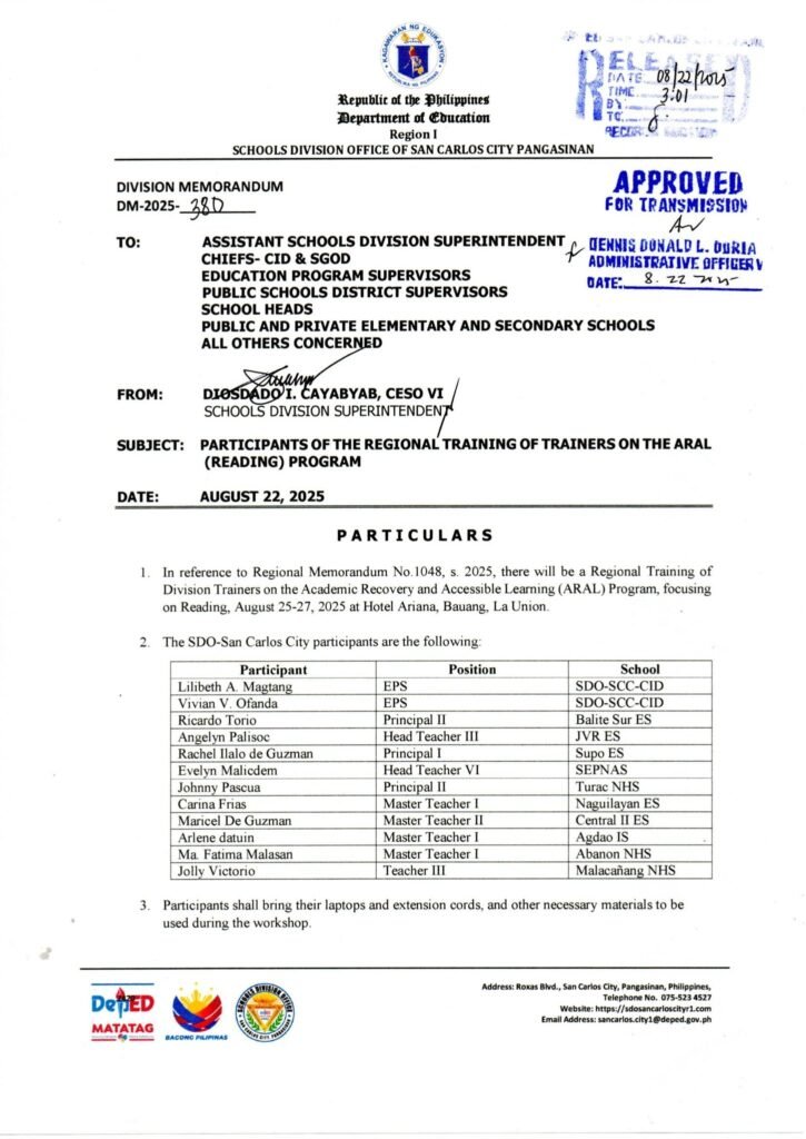 Division Memorandum No. 380 s, 2025 – PARTICIPANTS OF THE REGIONAL TRAINING OF TRAINERS ON THE ARAL (READING) PROGRAM