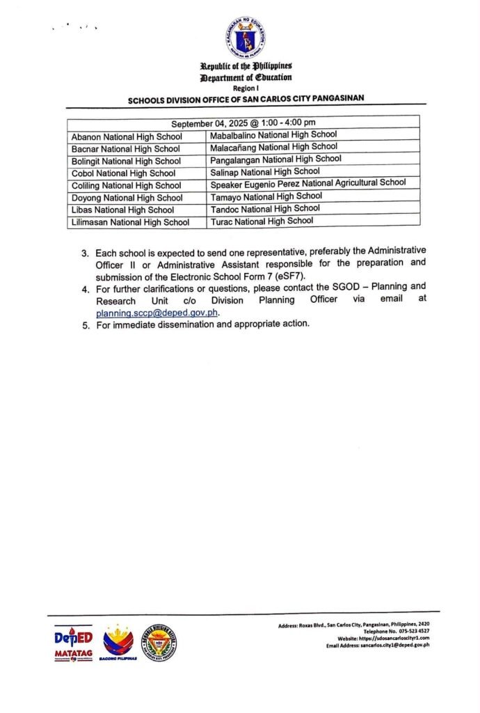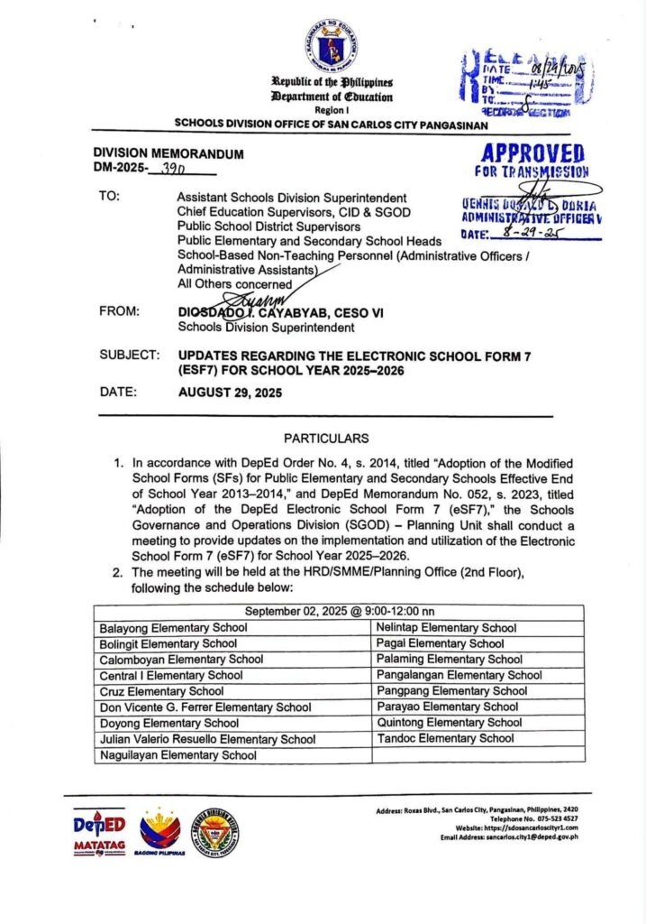 Division Memorandum No. 390 s, 2025 – UPDATES REGARDING THE ELECTRONIC SCHOOL FORM 7 (ESF7) FOR SCHOOL YEAR 2025-2026