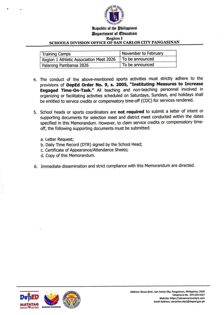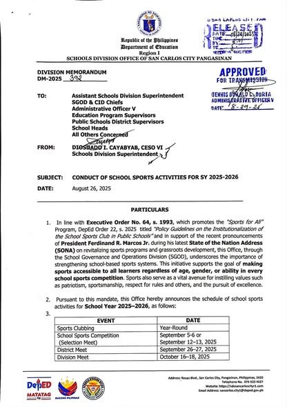 Division Memorandum No. 392 s, 2025 – CONDUCT OF SCHOOL SPORTS ACTIVITIES FOR SY 2025-2026