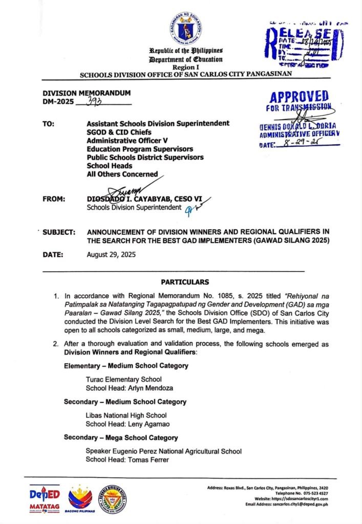 Division Memorandum No. 393 s, 2025 – ANNOUNCEMENT OF DIVISION WINNERS AND REGIONAL QUALIFIERS IN THE SEARCH FOR THE BEST GAD IMPLEMENTERS (GAWAD SILANG 2025)