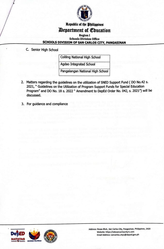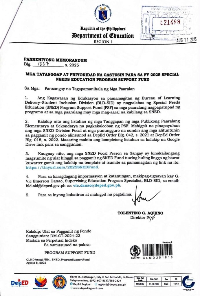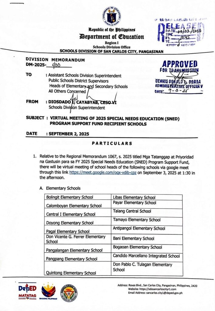 Division Memorandum No. 400 s, 2025 – VIRTUAL MEETING OF 2025 SPECIAL NEEDS EDUCATION (SNED) PROGRAM SUPPORT FUND RECIPIENT SCHOOLS