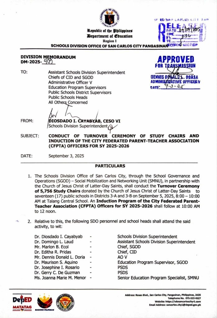 Division Memorandum No. 403 s, 2025 – Conduct of Turnover Ceremony of Study Chairs and Induction of the City Federated Parent-Teacher Association (CFTA) Officers for SY 2925-2026