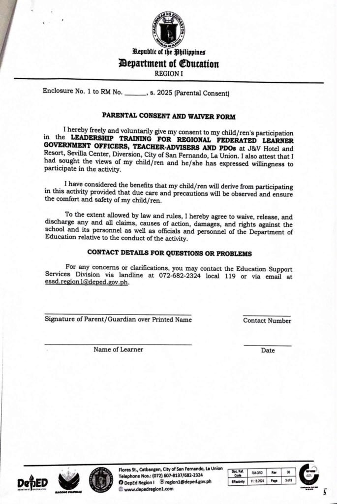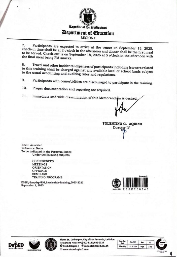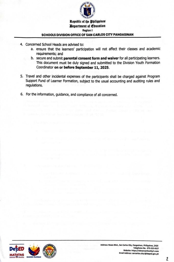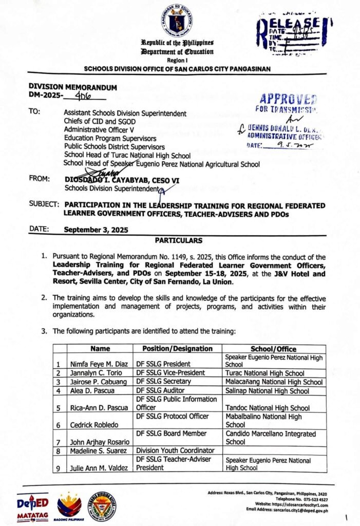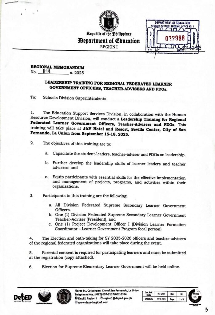 Division Memorandum No. 406 s, 2025 – PARTICIPATION IN THE LEADERSHIP TRAINING FOR REGIONAL FEDERATED LEARNER GOVERNMENT OFFICERS, TEACHER-ADVISERS AND PDOs