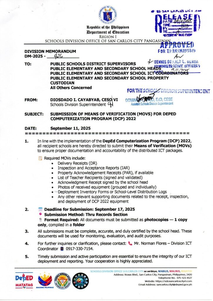 Division Memorandum No. 426 s, 2025 – SUBMISSION OF MEANS OF VERIFICATION (MOVs) FOR DEPED COMPUTERIZATION PROGRAM (DCP) 2022