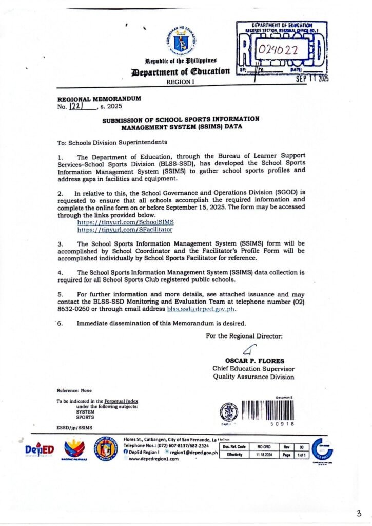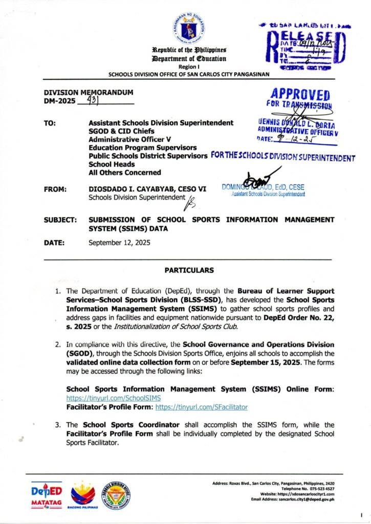 Division Memorandum No. 431 s, 2025 – SUBMISSION OF SCHOOL SPORTS INFORMATION MANAGEMENT SYSTEM (SSIMS) DATA