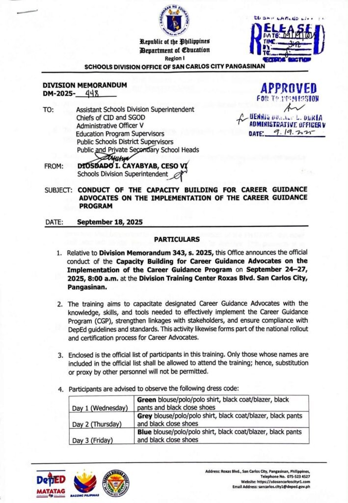 Division Memorandum No. 448 s, 2025 – CONDUCT OF THE CAPACITY BUILDING FOR CAREER GUIDANCE ADVOCATES ON THE IMPLEMENTATION OF THE CAREER GUIDANCE PROGRAM