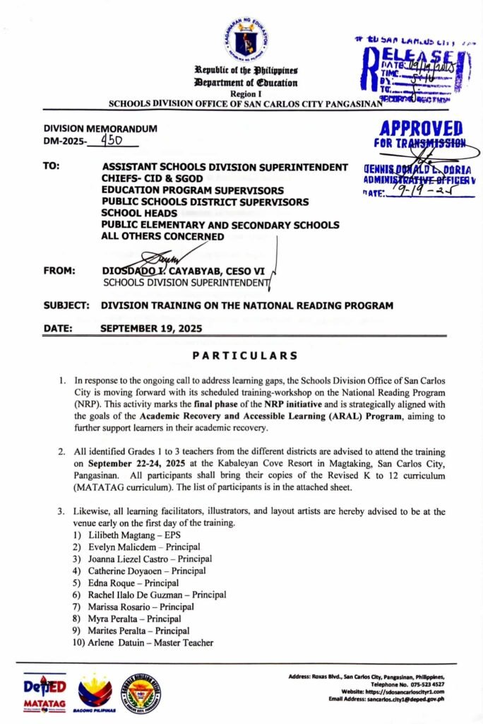 Division Memorandum No. 450 s, 2025 – Division Training on the National Reading Program