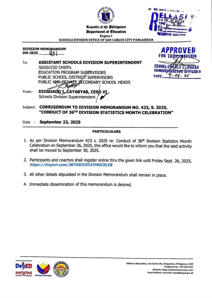 Division Memorandum No. 451 s, 2025 – CORRIGENDUM TO DIVISION MEMORANDUM NO. 423, S. 2025, “CONDUCT OF 36TH DIVISION STATISTICS MONTH CELEBRATION”