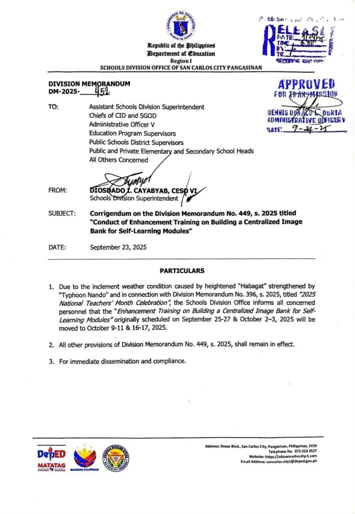Division Memorandum No. 452 s, 2025 – Corrigendum on the Division Memorandum No. 449, s. 2025 titled “Conduct of Enhancement Training on Building a Centralized Image Bank for Self-Learning Modules”
