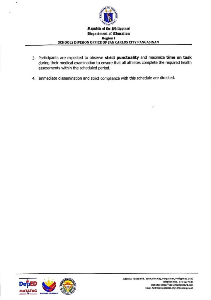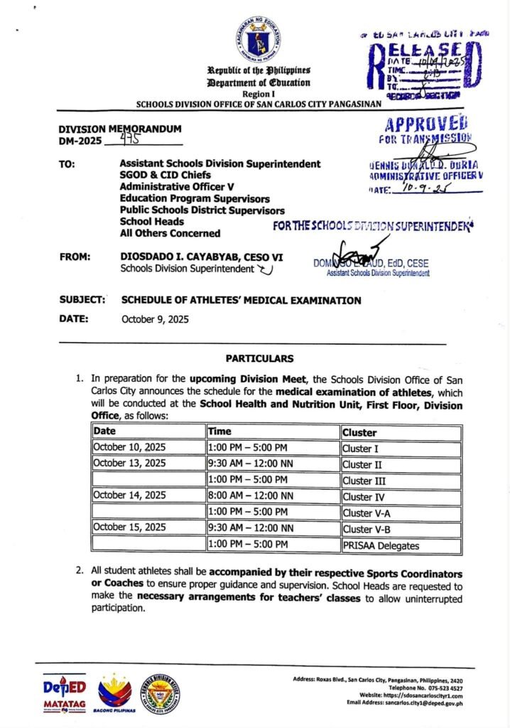 Division Memorandum No. 475 s, 2025 – SCHEDULE OF ATHLETES’ MEDICAL EXAMINATION