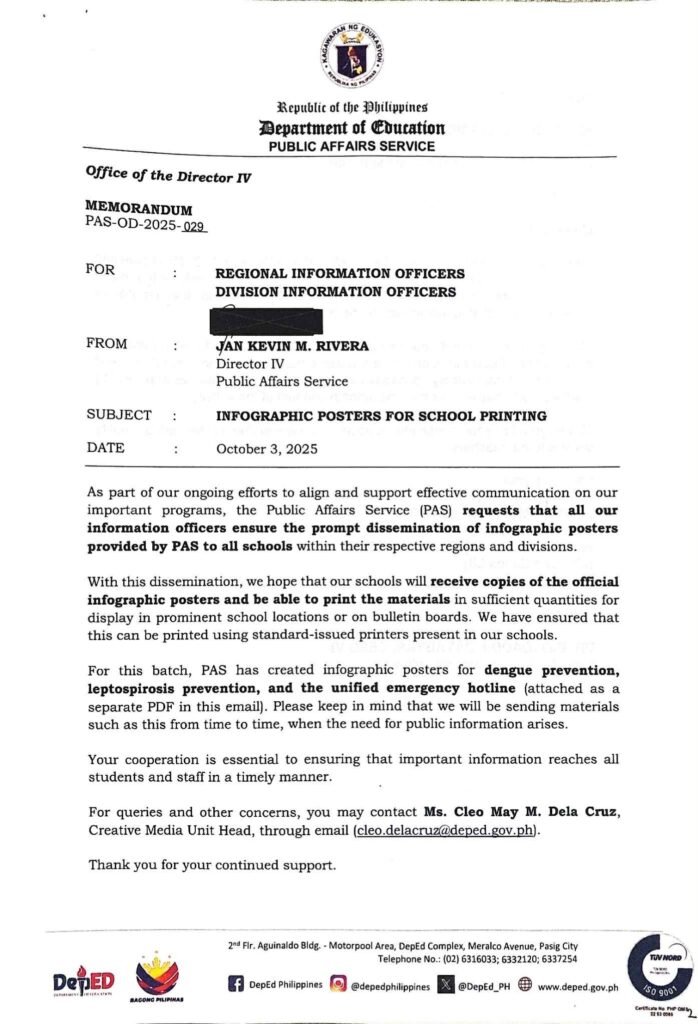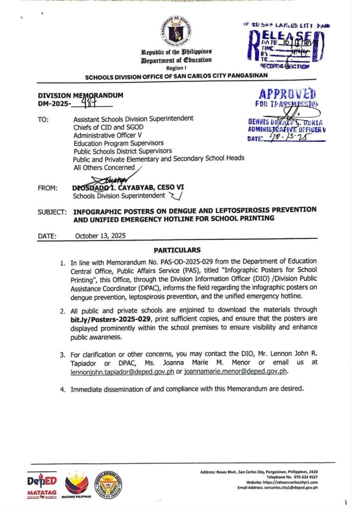 Division Memorandum No. 487 s, 2025 – INFOGRAPHIC POSTERS ON DENGUE AND LEPTOSPIROSIS PREVENTION AND UNIFIED EMERGENCY HOTLINE FOR SCHOOL PRINTING POSTERS: bit.ly/Posters-2025-029