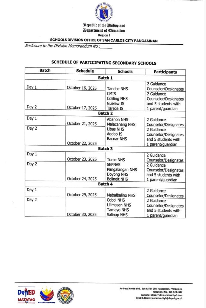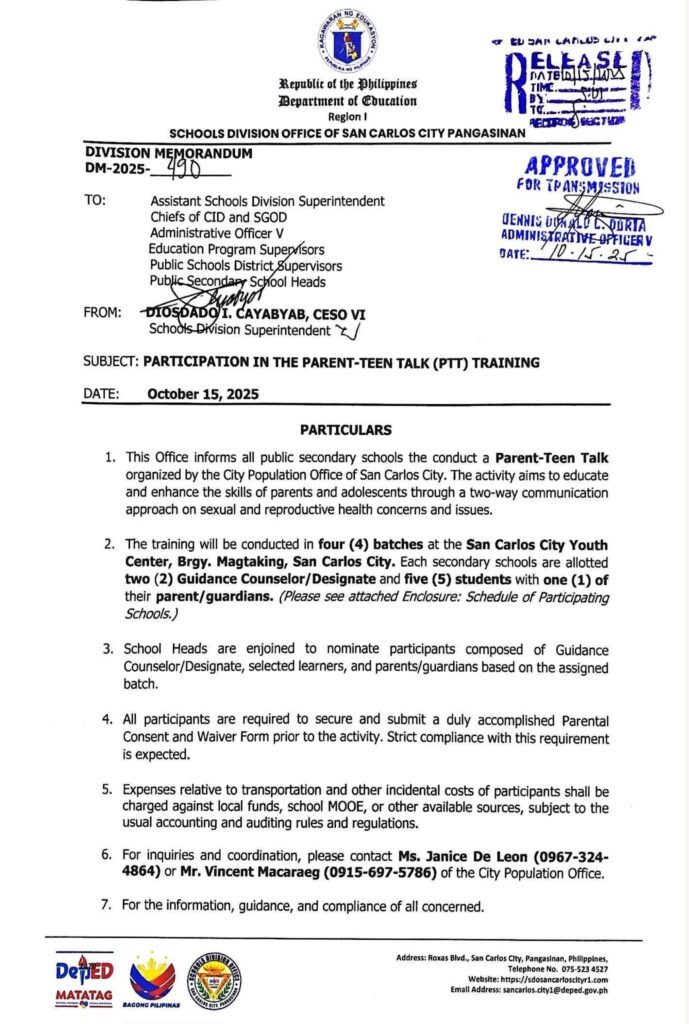Division Memorandum No. 490 s, 2025 – PARTICIPATION IN THE PARENT-TEEN TALK (PTT) TRAINING