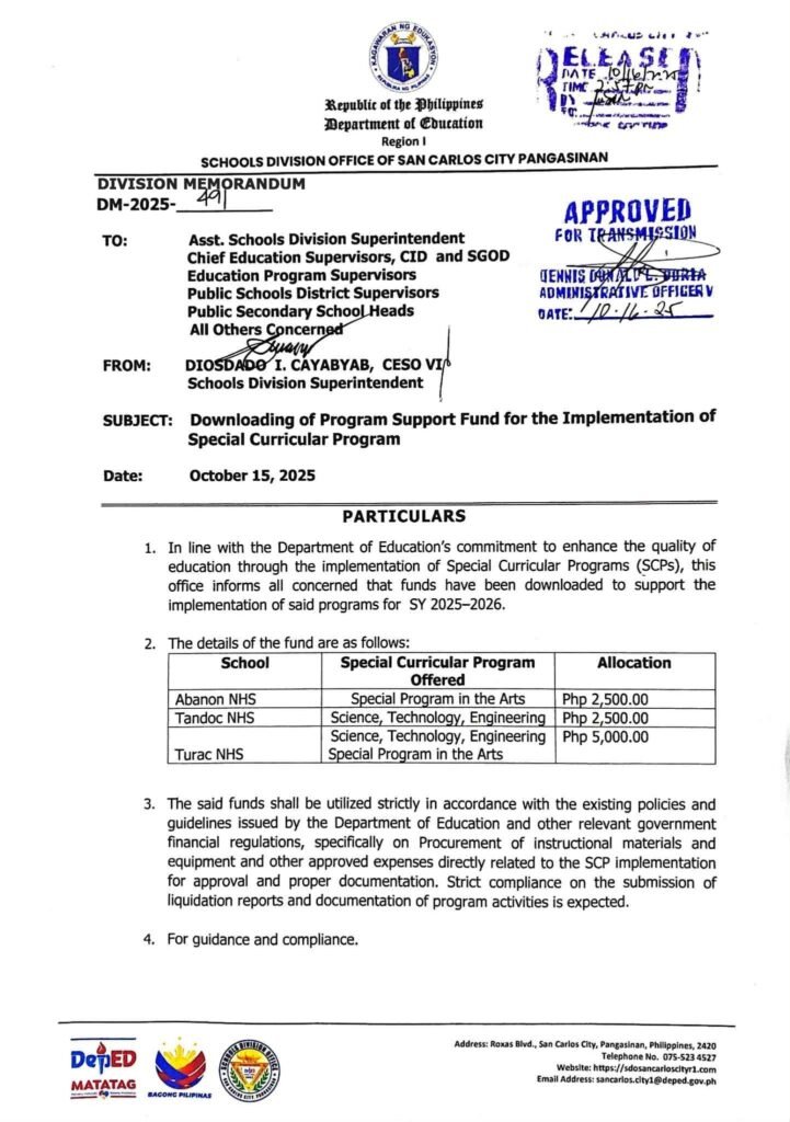 Division Memorandum No. 491 s, 2025 – Downloading of Program Support Fund for the Implementation of Special Curriculum Program