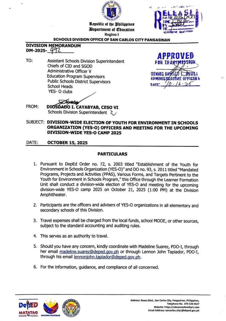 Division Memorandum No. 492 s, 2025 – DIVISION-WIDE ELECTION OF YOUTH FOR ENVIRONMENT IN SCHOOLS ORGANIZATION (YES-O) OFFICERS AND MEETING FOR THE UPCOMING DIVISION-WIDE YES-O CAMP 2025